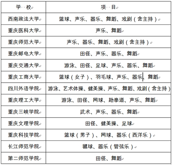 重庆市教委会联合重庆市大学中专招生委员会发布《关于重庆市2014年市属普通高校招收特长生的通知》,2014年重庆市将继续对在艺术、体育、创新实践等方面具有特长的应届高中毕业生,实行选拔测试认定后,可适当降低高考分数要求、录取到市属普通高校的政策。2014年重庆普通高校特长生招生资格院校表如下图: