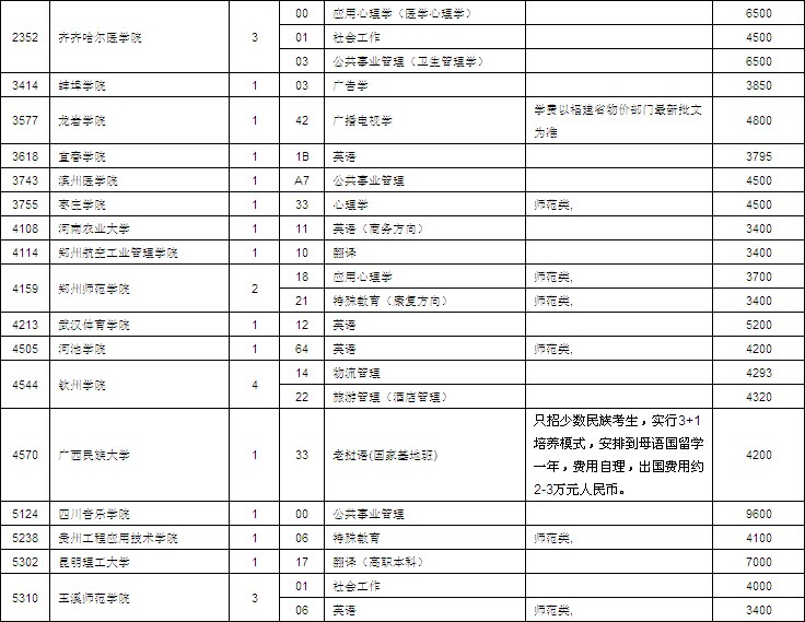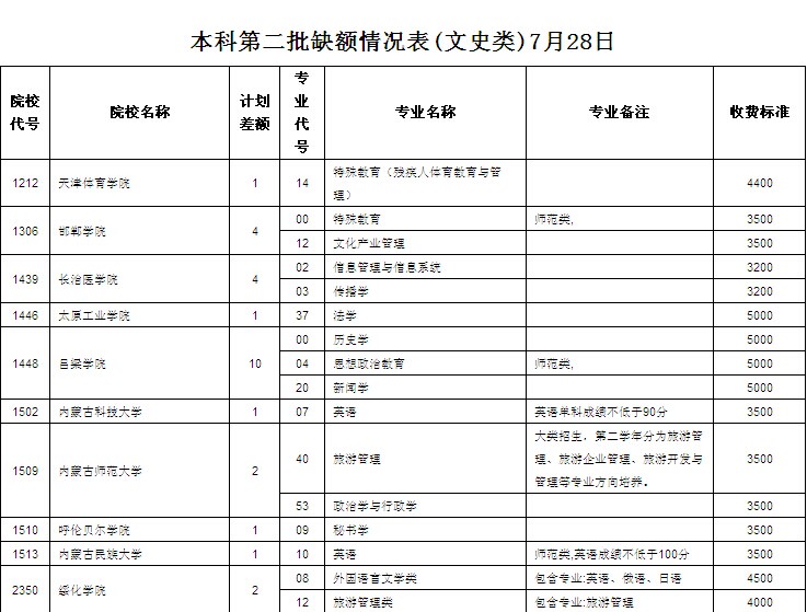 2014高考本科第二批缺额情况表(文史类)