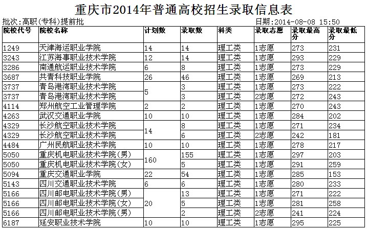 5050重庆机电职业技术学院(男)160155理工类1志愿297203