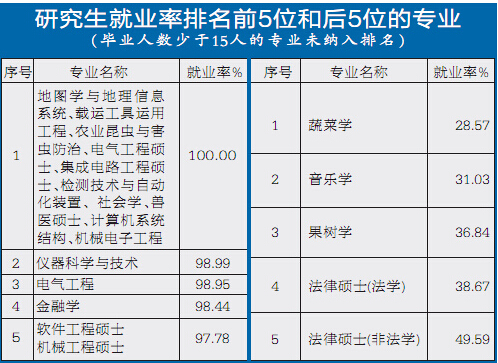 据报告显示,我市去年有10个研究生专业就业率达到了100%,包括:地图学与地理信息系统、载运工具运用工程、农业昆虫与害虫防治、电气工程硕士、集成电路工程硕士、检测技术与自动化装置、社会学、兽医硕士、计算机系统结构和机械电子工程。