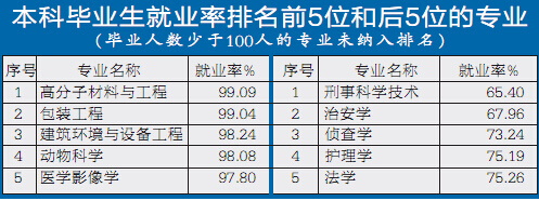 近日,重庆市教委公布了重庆市2014届高校毕业生就业情况报告,报告公布了去年重庆市高校毕业生各专业就业情况(详见图表):本科专业中,高分子材料与工程、包装工程、建筑环境与设备工程、动物科学、医学影像学等15个专业为就业率排名前15位的专业。