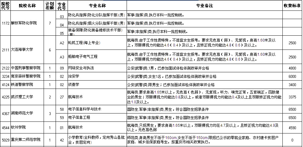 提前批本科缺额情况表(理工类)