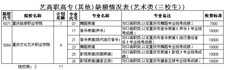 重庆市2015年艺术(其他)三校生缺额表