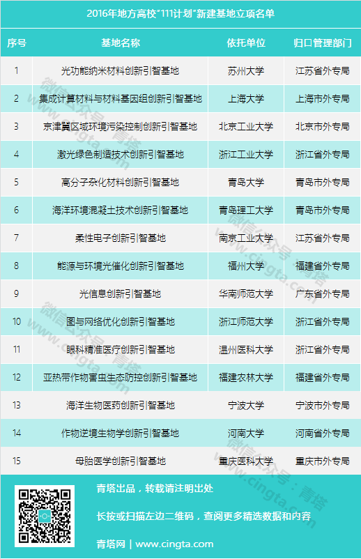 日前,国家外专局正式公布了2016年度地方高校“高等学校学科创新引智计划”(即“111计划”)立项名单,全国15所地方强校获批立项成为新建基地。值得注意的是,前几批入选“111计划”的都是中央部属高校,这是首次有地方高校入围。