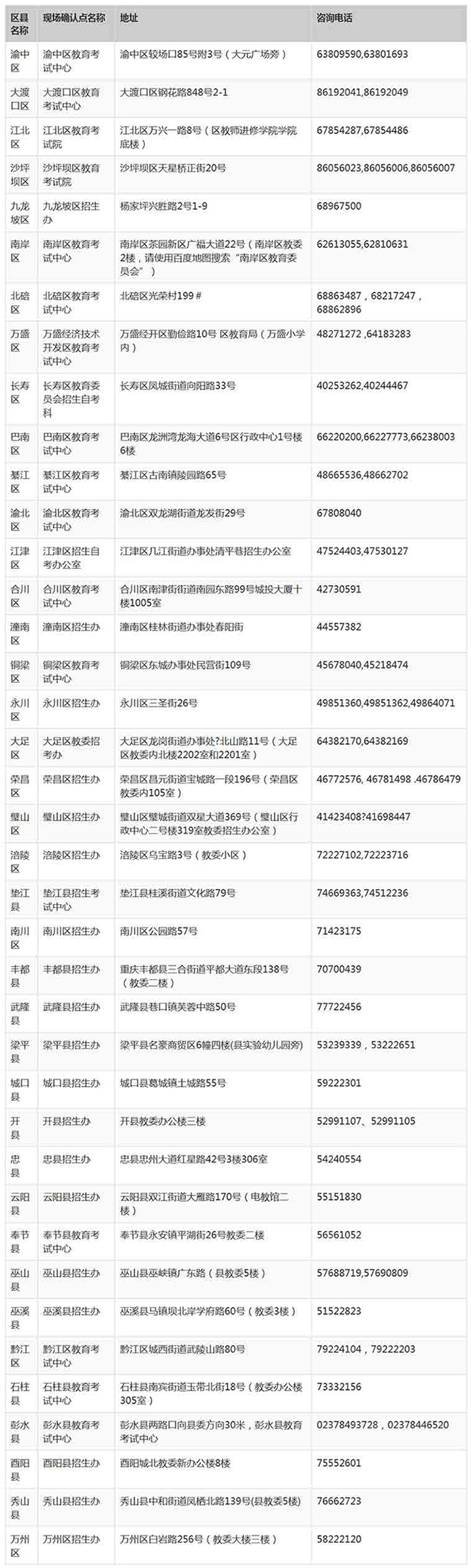 重庆成人高考各区县现场确认点地址及咨询电话