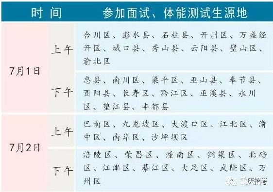 体能测试、面试时间:7月1日—2日(上午8∶00—12∶00,下午13∶00—18∶00)。