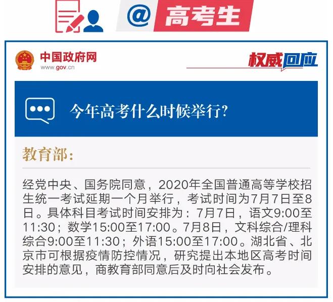 经党中央、国务院同意,2020年全国普通高等学校招生统一考试延期一个月举行,考试时间为7月7日至8日。