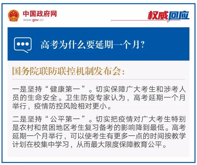 一是坚持“健康第一”。切实保障广大考生和涉考人员的生命安全。卫生防疫专家认为,高考延期一个月举行,疫情防控风险相对更小。