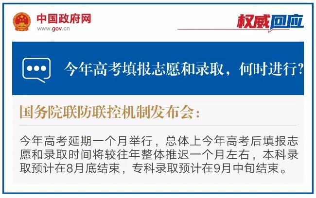 今年高考延期一个月举行,总体上今年高考后填报志愿和录取时间将较往年整体推迟一个月左右,本科录取预计在8月底结束,专科录取预计在9月中旬结束。