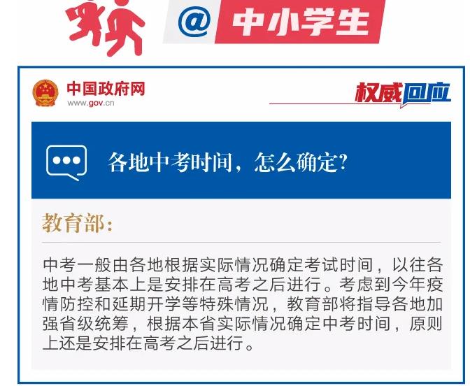 中考一般由各地根据实际情况确定考试时间,遗忘各地中考基本上是安排在高考之后进行。考虑到今年疫情防控和延期开学等特殊情况,教育部将指导各地加强省级统筹,根据本省实际情况确定中考时间,原则上还是安排在高考之后进行。