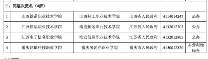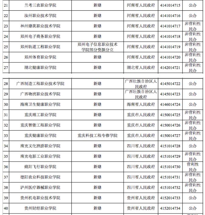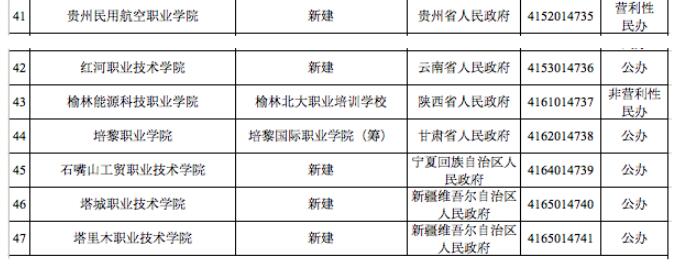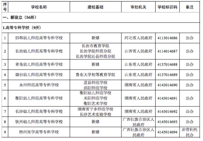 据教育部官网发布的信息,根据《中华人民共和国高等教育法》《普通高等学校设置暂行条例》等有关法律法规的规定,教育部办公厅公布了本年度省级人民政府审批新设、更名、合并调整、变更办学体制、撤销的专科层次高等学校备案名单。