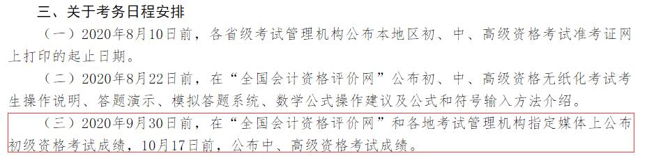 通知中规定:“一、2020年9月30日前,在“全国会计资格评价网”和各地考试管理机构指定媒体上公布初级资格考试成绩,10月17日前,公布中、高级资格考试成绩。”