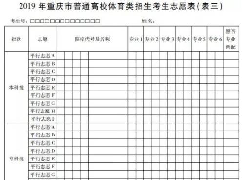 三、2019年重庆市普通高校体育类招生考生志愿表