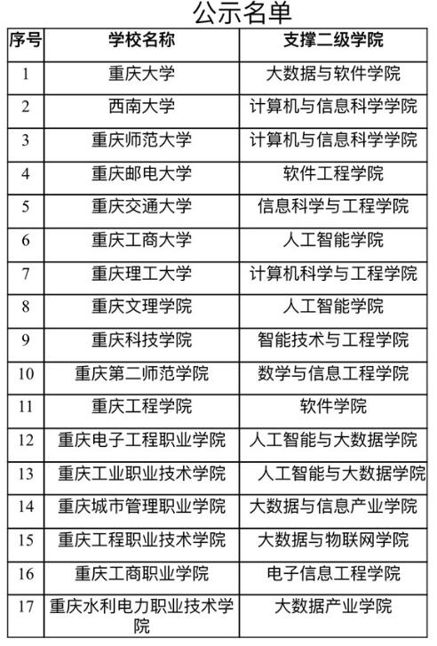 为主动应对新一轮科技革命和产业变革的挑战,落实国家软件发展战略相关要求,2020年10月,教育部开展了首批特色化示范性软件学院建设工作。根据教育部要求,重庆市教委、市经济信息委联合下发通知,决定创建一批重庆市特色化示范性软件学院。通知明确,将围绕全市软件产业发展重点,在关键基础软件、大型工业软件、行业应用软件、新型平台软件、嵌入式软件等五大领域,根据办学层次进行创建。