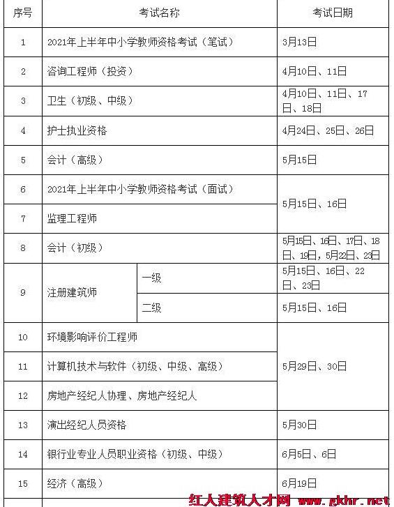 注:以上为人社部公布2021专业技术人员职业资格考试时间,其中二级建造师考试时间暂未公布,请继续关注当地人社部官方网站或红人建筑人才网 了解更多建造师考试信息。