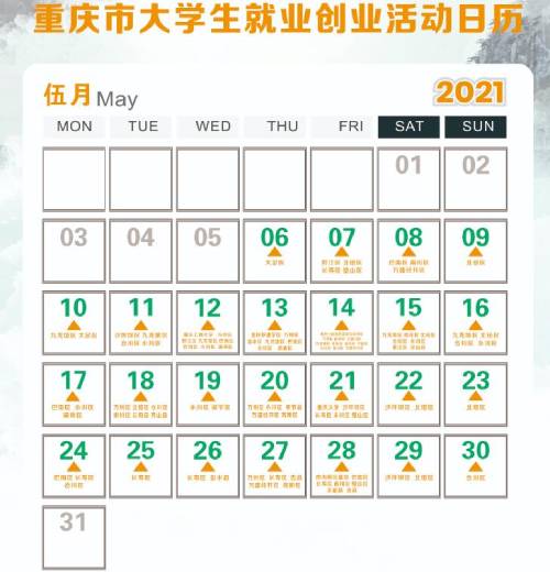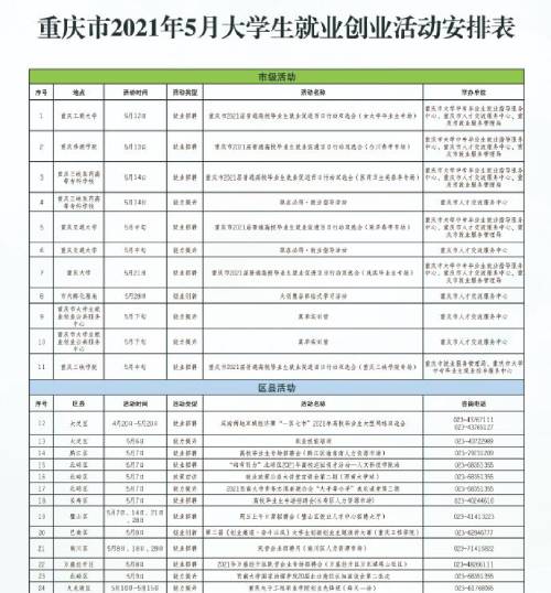 重庆2021年5月大学生就业创业活动安排发布发布时间:2021/5/6 10:41:43 | 人感兴趣 | 评分:3