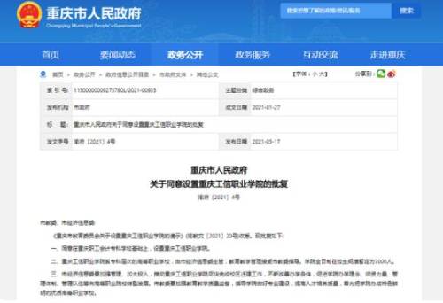 5月17日,重庆市政府网发布《重庆市人民政府关于同意设置重庆工信职业学院的批复》。《批复》同意,在重庆职工会计专科学校基础上,设置重庆工信职业学院。