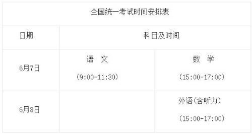 (1)全国统一考试。全国统一考试科目考试时间安排在6月7日全天和6月8日下午,其中语文考试时长为150分钟,数学、外语考试时长均为120分钟。