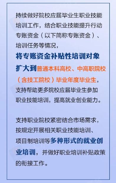 近日,人力资源社会保障部、财政部、教育部共同印发《关于扩大院校毕业年度毕业生参加职业技能培训有关政策范围的通知》。