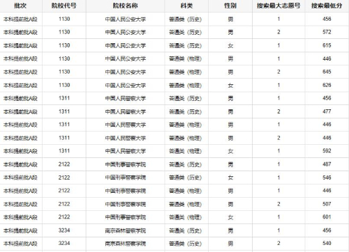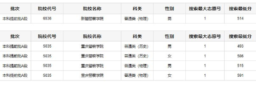 本科层次的部属公安院校和新疆警察学院定向培养招生面试、体检、体能测评参加对象:对符合相关条件且填报有公安院校志愿的重庆户籍考生,按照志愿优先的原则,区分院校、性别、首选科目,从高分到低分,按照在渝招生计划数的5倍(重庆警察学院按3倍)确定。先搜索一志愿,再搜索二志愿。搜索最大志愿号为1表示一志愿生源已经足够,不再搜索二志愿考生,其搜索最低分为一志愿入围考生最低分;搜索最大志愿为2表示一志愿控制线上考生已全部入围,其搜索最低分为二志愿入围考生最低分。根据教育部关于国家专项招生工作有关文件精神,有国家专项计划的公安院校体测人数已足参检倍数、但如具有国家专项计划资格人数不足国家专项计划倍数的院校,可根据合格生源情况按志愿顺序从高分到低分依序递补具有国家专项资格考生参加测试。