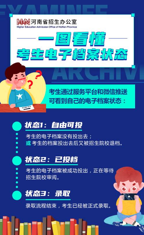据河南省招生办公室近日发布消息,考生通过服务平台和微信推送可以看到自己的电子档案状态,大致包括以下这3种。