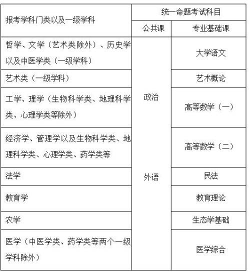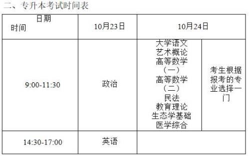 3.专升本:专升本统考科目为政治、英语和专业基础课,共3科。专业基础课根据各学科门类的特点设置8个科目(详见附表-1),由招生院校按专业的需要规定考生应试其中1个科目。