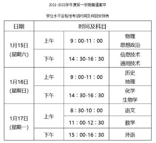 关于重庆市2021-2022学年度第一学期普通高中学业水平合格性考试时间将于2022年1月15日-17日进行,具体考试安排如下: