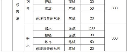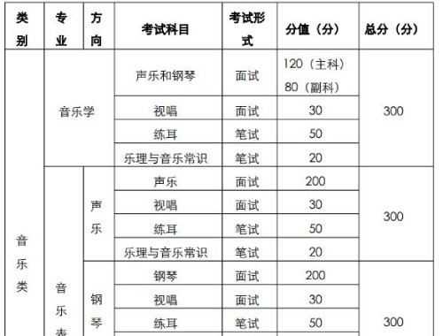 注:1.音乐学专业“声乐和钢琴”科目中分数较高的一门为主科,另一门为副科。