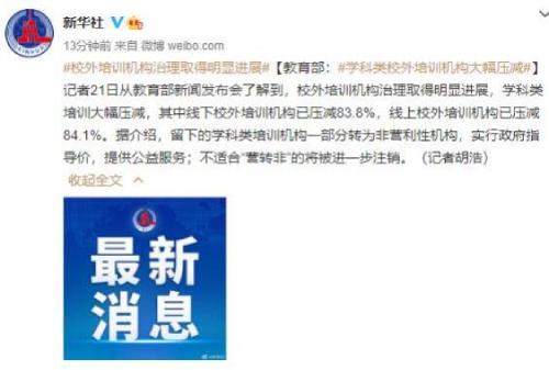 据新华社12月21日报道,从教育部新闻发布会了解到,校外培训机构治理取得明显进展,学科类培训大幅压减,其中线下校外培训机构已压减83.8%,线上校外培训机构已压减84.1%。据介绍,留下的学科类培训机构一部分转为非营利性机构,实行政府指导价,提供公益服务;不适合“营转非”的将被进一步注销。