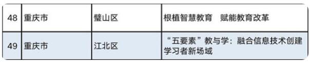 近日,教育部组织开展了2021年度基础教育信息技术与教育教学深度融合典型案例的评审工作,共有66个区域和44个学校被评为示范案例。其中,重庆市江北区、璧山区,沙坪坝区树人景瑞小学、璧山区实验小学分别入选示范区域和示范学校。(来源:上游新闻)