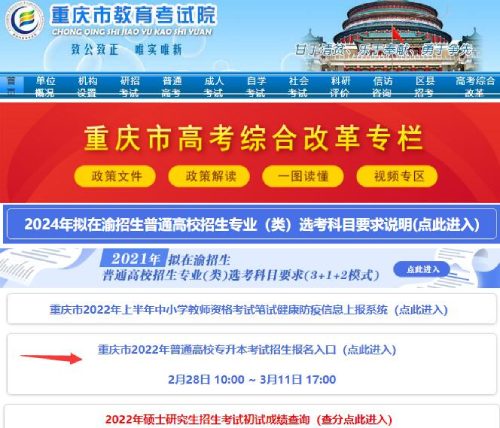 NO.1考生请登录重庆教育考试院或者重庆招考信息网,点击首页中的“重庆市2022年普通高校专升本考试报名入口”栏目,进入报名系统。