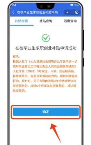 第六步,签字完成后,点击【确定】,进入申报凭证上传页面,选择附件凭证材料后,点击【提交】,页面显示补贴申请成功,点击【确定】还可进行进度查询和补贴查询。