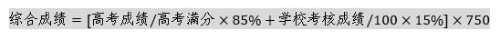 综合成绩(总分750.00分,精确至小数点后两位)由高考成绩(不含任何政策加分)和学校考核成绩两部分组成,折算办法如下: