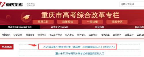 请考生在规定时间内,登录重庆市教育考试院(https://www.cqksy.cn/)或重庆招考信息网(https://www.cqzk.com.cn/),点击上方“2022年高职分类考试招生“普高类”志愿填报系统入口”进入填报系统。