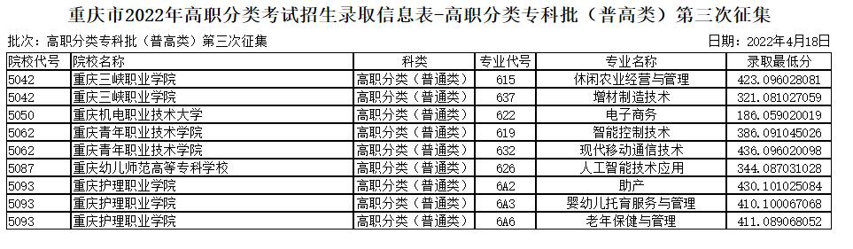 4月18日,重庆教育考试院发布了关于2022年高职分类考试专科批(普高类)第三次征集招生录取信息,具体录取信息如下: