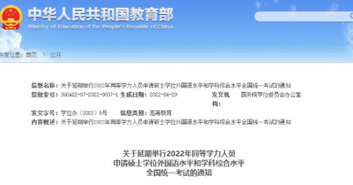关于延期举行2022年同等学力人员申请硕士学位外国语水平和学科综合水平全国统一考试通知
