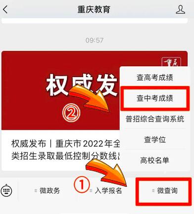 进入【重庆教育】官方微信(ID:cqjynews)-【微查询】-【查中考成绩】,输入准考证号和中考填报志愿时设置的密码,查询中考成绩。