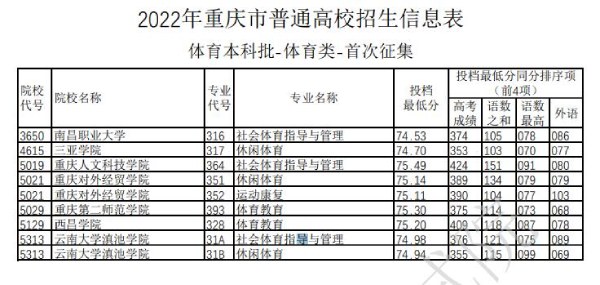 据市教育考试院发布的通知,关于2022年重庆市普通高校招生体育类本科批首次征集志愿投档录取分数公布了,一起来看看。