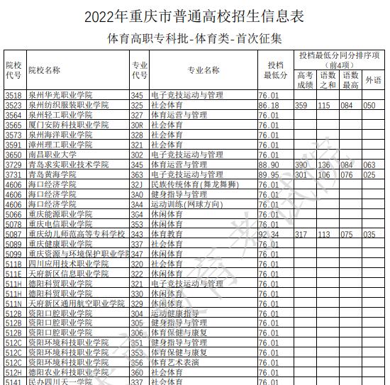 关于2022年重庆普通高校招生信息表(体育高职专科批)首次征集投档分数线已经公布,特为大家整理了2022年体育类高职专科批各院校投档分数如下,供大家参考。