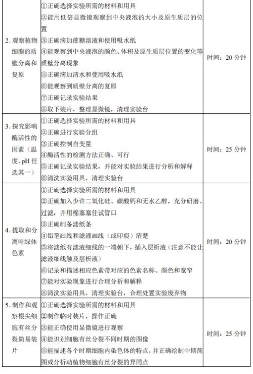 日前,重庆市教育考试院公布了重庆市普通高中学业水平合格性考试实验实作考查标准(2022年版),自2022年12月起,化学、生物学、物理、通用技术实验实作考查标准均以2022年版为参考。具体生物学实验实作考查标准如下: