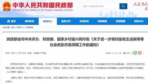 因疫情3个月无收入的这类人,可领取救助金11月8日,据民政部网站消息,民政部会同中央农办、财政部、国家乡村振兴局联合印发《关于进一步做好最低生活保障等社会救助兜底保障工作的通知》(民发〔2022〕83号,下称《通知》)。