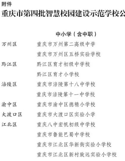 近日,重庆市教委对第五批智慧校园建设示范学校入选名单进行公示,经自主申报、逐级推荐、专家评审,拟将重庆工程学院等6所高校、重庆市黔江区民族职业教育中心等5所中职学校和重庆市万州区福建小学等64所中小学校认定为重庆市第五批智慧校园建设示范学校。