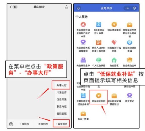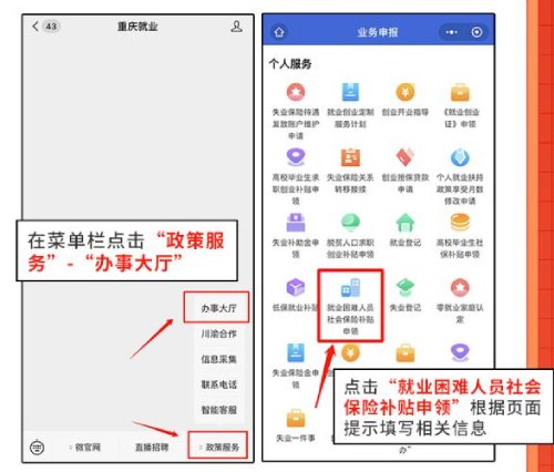 灵活就业人员通过“重庆智能就业平台”线上申请补贴。进入“重庆就业”微信公众号,在菜单栏依次点击【政策服务】-【办事大厅】