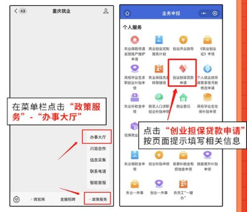 通过“重庆智能就业平台”线上申请创业担保贷款。进入“重庆就业”微信公众号,在菜单栏依次点击【政策服务】-【办事大厅】。