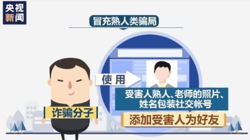 诈骗分子使用受害人熟人、老师的照片、姓名包装社交账号,添加受害人为好友。以熟人的身份对受害人嘘寒问暖表示关心,或模仿熟人、老师等人语气向受害人发出转账或缴纳费用的指令信息,并以时间紧迫、机会难得等借口催促受害人转账。