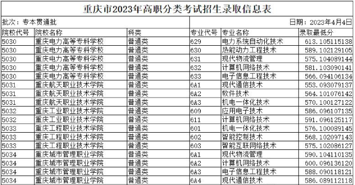 关于重庆市2023年高职分类考试招生录取信息表已公布,公布批次专本贯通批(第一次征集),具体录取信息如下: