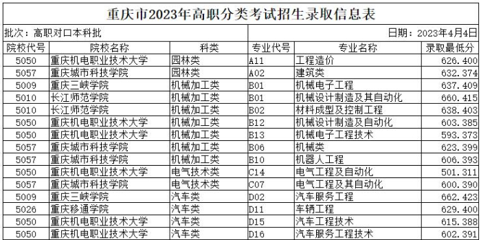 关于重庆市2023年高职分类考试招生录取信息表已公布,公布批次高职对口本科批,具体录取信息如下: