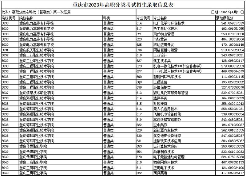 关于重庆市2023年高职分类考试招生录取信息公布 ——高职分类专科批(普高类)第一次征集信息公安:具体如下: