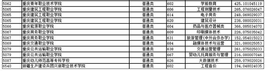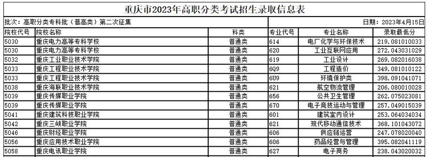 重庆教育考试院公布了关于2023年高职分类考试专科批第二次征集招生录取信息,以下是2023高职分类专科批——普高类第二次征集招生录取信息表: