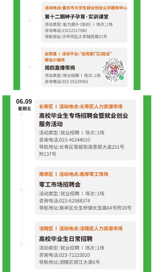 下周,全市共15场大学生就业创业活动。其中,包括高校毕业生现场招聘会、种子孕育·实训课堂、大学生创新创业大赛赛事辅导等活动,欢迎大家踊跃参加!